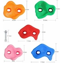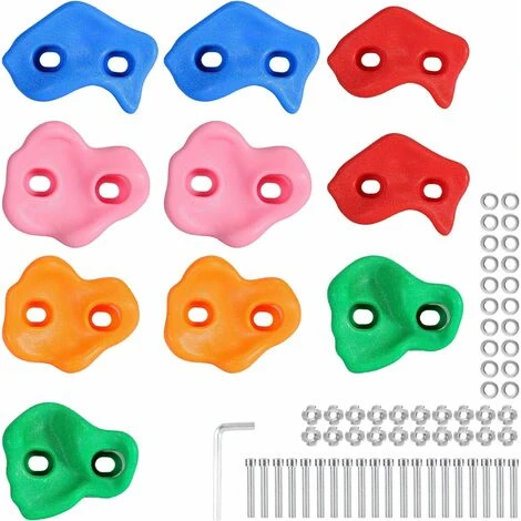 - Les poignées de mur d’escalade ont 5 couleurs, et chaque couleur a deux pierres d’escalade. Il y a 10 vis, 10 rondelles, 10 écrous et 1 tournevis.