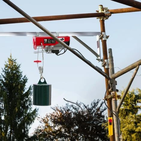 Le câble de traction électrique d’AREBOS permet une hauteur de levage maximale de 12 mètres ou, en cas d’utilisation de la poulie, une hauteur de levage de 6 mètres. Bien que la hauteur de levage soit réduite de moitié lors de l’utilisation de la poulie, la capacité de charge maximale double en retour.