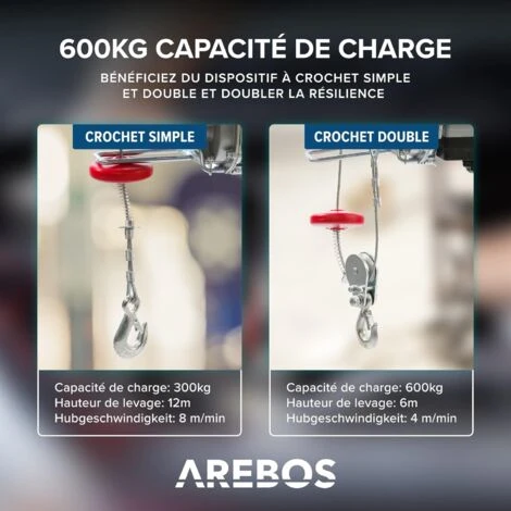 [RAPIDE ET EFFICACE] Le palan électrique d’AREBOS tire ou descend des charges avec une vitesse de 8 m/min (sans poulie) ou 4 m/min (avec poulie).