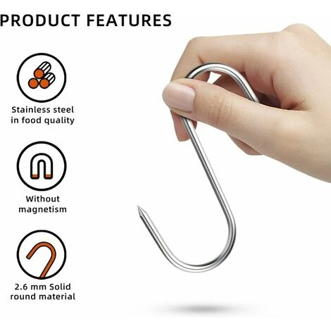 - Super haute qualitĂ© : crochet en forme de S en acier inoxydable, rĂ©sistant au sel et Ă l’acide, ne rouille pas, poli, une extrĂ©mitĂ© est pointue, une extrĂ©mitĂ© est Ă©moussĂ©e, acier inoxydable de qualitĂ© alimentaire, l’Ă©paule est lisse et non rainurĂ©e,