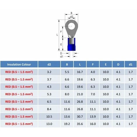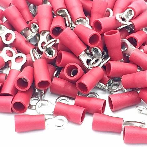100 pièces de cosses à sertir rouges isolées de PVC de 3,2 mm de diamètre. Connecteurs annulaires à fil rouge adaptés aux tailles de fil de 0,5 à 1,5 mm2. Les cosses à anneau isolées sont fabriquées d’une seule pièce, offrant un excellent rapport qualité-prix et une connexion fiable.
