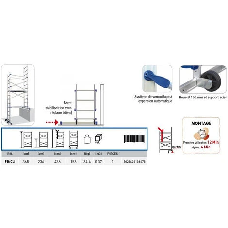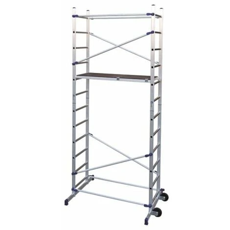 – Echafaudage tout aluminium, composĂ© de 2 rehausses de 6 Ă©chelons et muni de jonctions en acier plastifiĂ©.