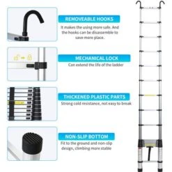 Échelle télescopique pliable : L’échelle a une conception pliable avec une hauteur de 3,2 mètres et un total de 11 marches. Le boulon de verrouillage est automatiquement verrouillé à chaque pas, de sorte que la hauteur de l’échelle peut être ajustée selon les besoins. Le crochet amovible supplémentaire est facile à installer et offre une stabilité et une protection supplémentaires. Le crochet de l’échelle peut être accroché à un tuyau d’un diamètre inférieur à 7 cm.