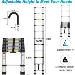 PORTABLE ET FLEXIBLE : L’échelle télescopique est en aluminium léger mais de haute qualité alliage et ne pèse que 9,3 kg. Une fois pliée, l’échelle à coulisse ne mesure que 0,81 m de haut, réglable en hauteur jusqu’à 3,2 m. Elle peut être rangée au sous-sol, dans le grenier ou dans le débarras pour gagner de la place et être facile à transporter.