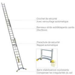 – Roulettes de façade en haut de l’échelle pour faciliter le déploiement contre le mur.