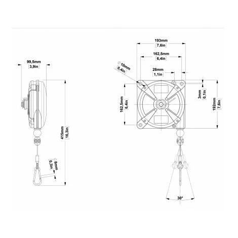 CaractĂ©ristiques : BoĂ®tier en fonte d’aluminium Câble de traction en inox 4 points de suspension 3 points d’ancrage