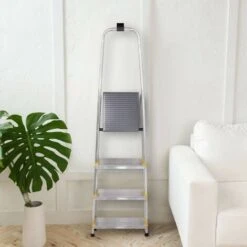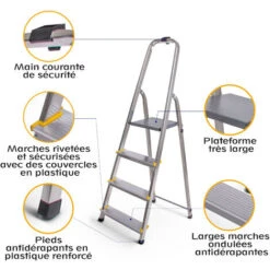 Léger et pliable : conçu en aluminium, l’escabeau est léger, facile à plier et à ranger.
