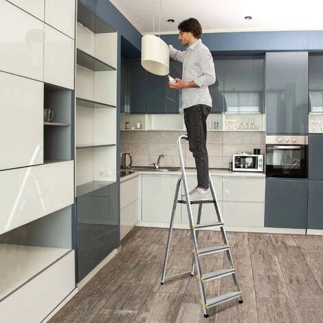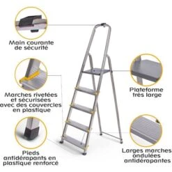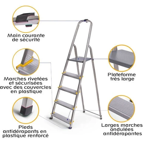 Léger et pliable : conçu en aluminium, l’escabeau est léger, facile à plier et à ranger.