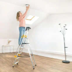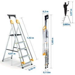 Léger et pliable : Conçu en aluminium, l’escabeau est léger, facile à plier et à ranger.