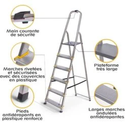 Léger et pliable : conçu en aluminium, l’escabeau est léger, facile à plier et à ranger.