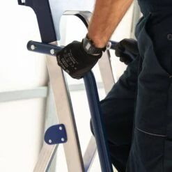 Rampe ergonomique : les deux mains courantes sont indispensables pour un soutien accru lors de la montée et de la descente de l’escabeau. Elles sont amovibles et peuvent être fixées à la hauteur de votre souhait via un astucieux système de serrage.
