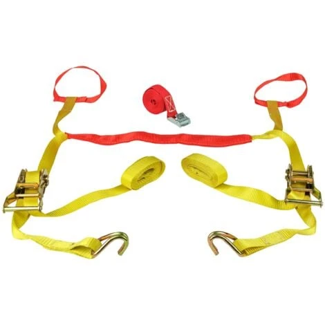 Ce jeu de sangles permet d’arrimer une moto allant jusqu’Ă 1300 kg sur une remorque.