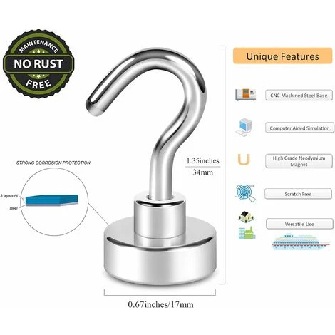 La triple couche de nickel sur le crochet magnétique augmente considérablement la résistance à la corrosion. Sans entretien et sans rouille.