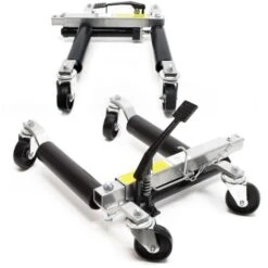 La paire de chariots de haute qualité va vous simplifier le travail dans les ateliers, les salles d’exposition de voiture, les musées, dans les foires commerciales, dans les courses de voiture etc. Les crics hydrauliques représentent une aide idéale pour soulever les voitures au niveau des roues et ce sans déployer beaucoup de force, ainsi que de ranger ou de déplacer le véhicule dans plusieurs positions même dans des espaces confinés. Le chariot se glisse tout simplement sous le pneu du côté latéral de la voiture. Grâce à une pédale intégrée, vous pouvez soulever le véhicule au niveau que vous désirez jusqu’à ce que la roue flotte librement. Pour ce faire, le cric va être contracté de manière hydraulique, jusqu’à ce que la roue en question perde l’adhérence au sol. Convient à une largeur de pneus de 30 cm environ.
