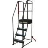 - SĂCURITĂ ASSURĂE – Pieds et garde-corps verrouillĂ©s – Marches caillebotis acier confortables et profondes – 4 pieds stabilisateurs fixes – Plinthes antichute – Portillon avec blocage mĂ©canique