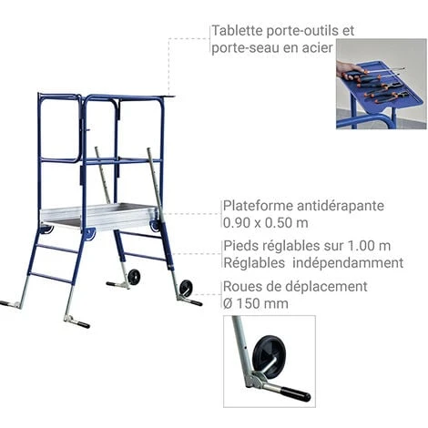 – 1.00m d’amplitude de rĂ©glage des pieds pour travailler dans les escaliers.