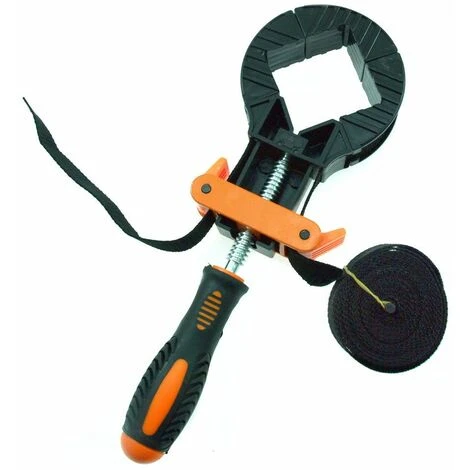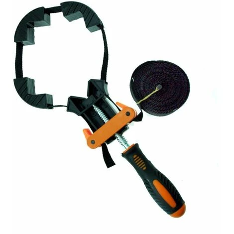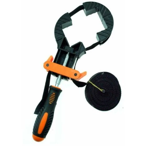 Presse de menuiserie à sangle qui permet le serrage d’éléments collés de grandes dimensions avec un angle de 90 degrés. L’outil convient pour coller des cadres, des tableaux, des boites, des fûts, etc. Dimension minimale des éléments collés : 30 x 30 mm (avec une mâchoire installée) et 60 x 60 mm avec toutes les mâchoires. Longueur de ceinture/sangle : 4M. L’usage consiste à écarter les mâchoires sur les bords de l’ouvrage à coller, à positionner la ceinture et à la bloquer avec deux verrous. Lorsque la sangle est bien tendue, il vous suffit de faire avancer la mâchoire basse en la serrant avec la poignée vis. La pince est conçue de manière ergonomique, les 4 mâchoires sont fixées sur la sangle afin qu’elles ne tombent pas, ce qui améliore considérablement le confort de travail, son utilisation. La pince est rapide à utiliser et a une très large gamme d’applications. Inclus : 3 coins/mâchoires de serrage en plastique.