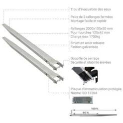 – Rallonges de fourches avec blocage par goupille sur les fourches du chariot spécialement conçues pour des opérations de manutention de charges longues, surdimensionnées et volumineuses par des chariots élévateurs.