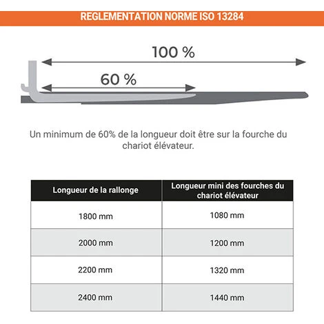 – En utilisant des rallonges de fourches, la capacité de charge max de votre chariot est modifiée. Prenez en compte une marge pour éviter le risque de chutes et de versement.