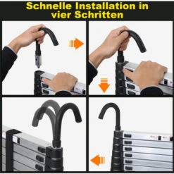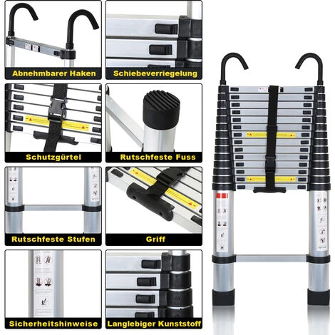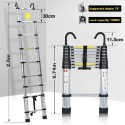 Ăchelle tĂ©lescopique pliable : L’Ă©chelle a une conception pliable avec une hauteur de 2,6 mĂštres et un total de 9 marches. Le boulon de verrouillage est automatiquement verrouillĂ© Ă chaque pas, de sorte que la hauteur de l’Ă©chelle peut ĂȘtre ajustĂ©e selon les besoins. Le crochet amovible supplĂ©mentaire est facile Ă installer et offre une stabilitĂ© et une protection supplĂ©mentaires. Le crochet de l’Ă©chelle peut ĂȘtre suspendu Ă un tuyau d’un diamĂštre infĂ©rieur Ă 7 cm.