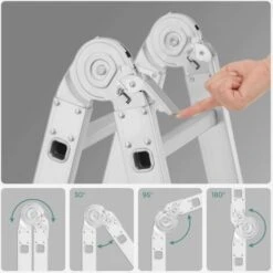 - Flexibilité, sécurité : Renforcée par des charnières de 10 cm de diamètre et sécurisée par des verrous de sécurité, la forme de l’échelle peut être facilement modifiée : échafaudage, en A, escabeau, échelle droite, etc.