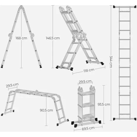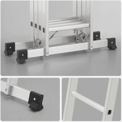 SécuritéComparés aux petits dispositifs de verrouillage des articulations de la concurrence, ceux de SONGMICS sont plus grands, leur capacité de charge et leur nombre de fois d’utilisation sont 2 fois plus importants que les petits dispositifs. Ils peuvent être verrouillés et débloqués pour transformer facilement la forme de l’échelle. | StabilitéLes 2 barreaux et les patins antidérapants assurent une parfaite stabilité. | Plate-forme de travail confortableLes deux plate-formes de travail amovibles et antidérapants sont à positionner sur votre échelle pour travailler en toute sécurité. |