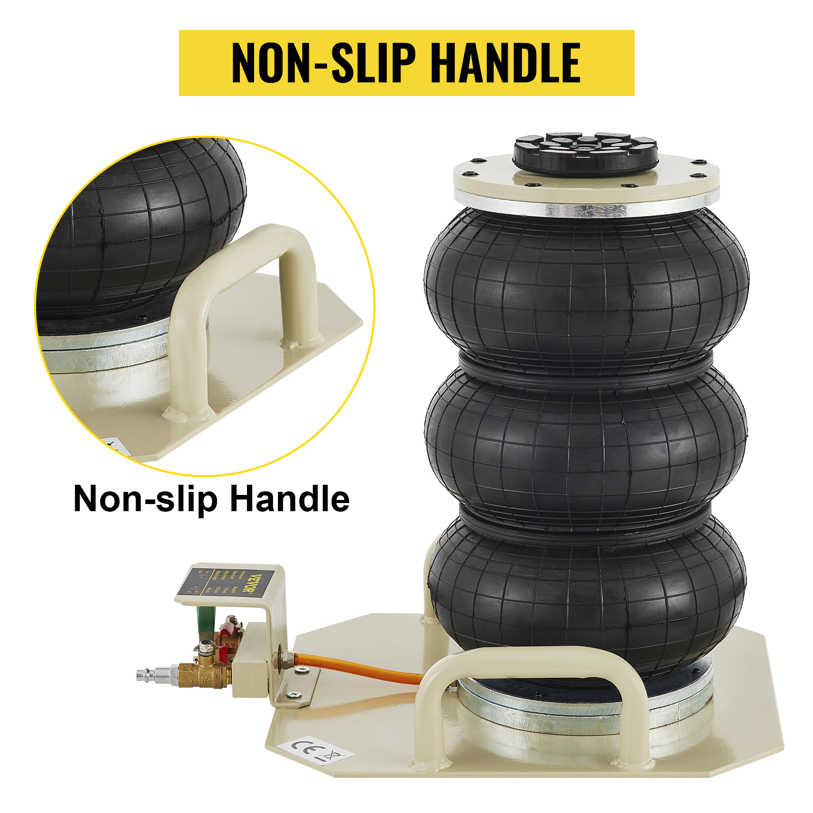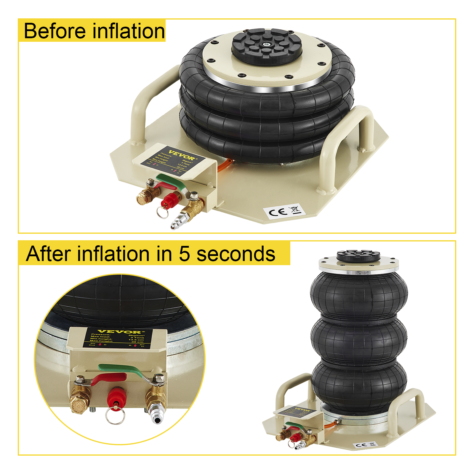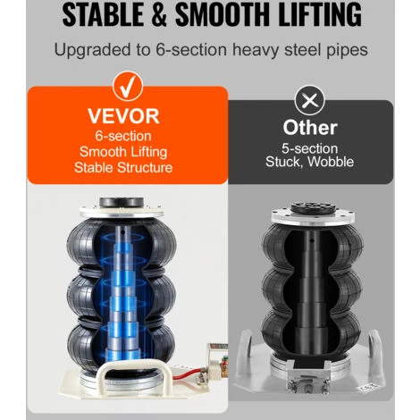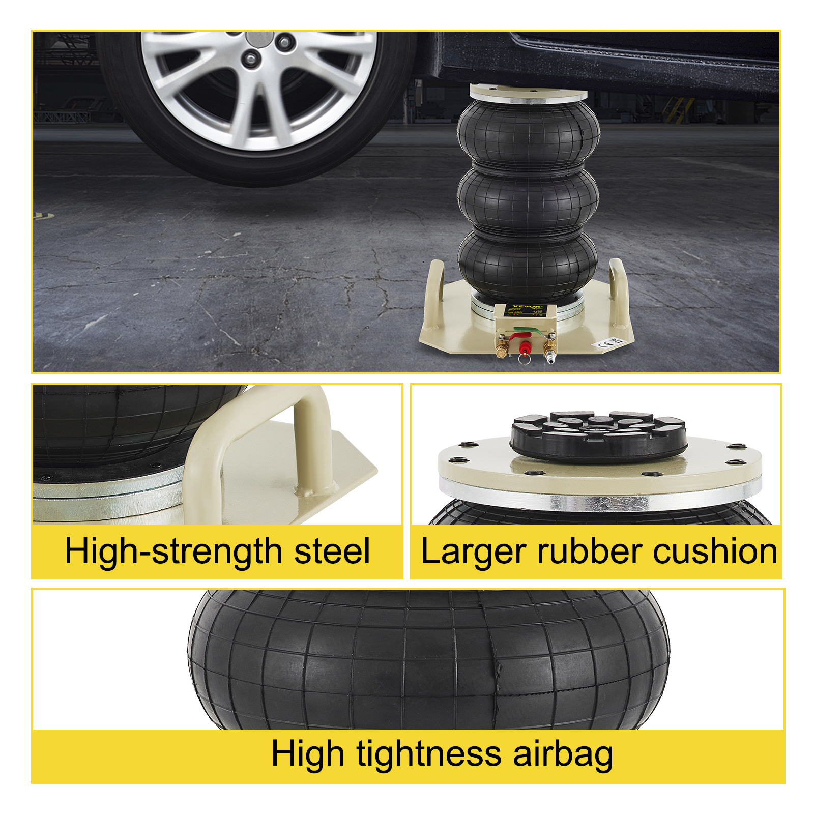 - Construction Robuste : Notre cric pneumatique est construit avec de lacier haute resistance qui rend lensemble du corps robuste et durable. Le cadre en acier revetu de poudre et le caoutchouc correspondent pour reduire limpact. Les coussins deair hautement etanches ne fuiront pas et ne seront pas rayes. Une plus grande zone de pression sadapte a un endroit doux et facile a ecraser.