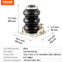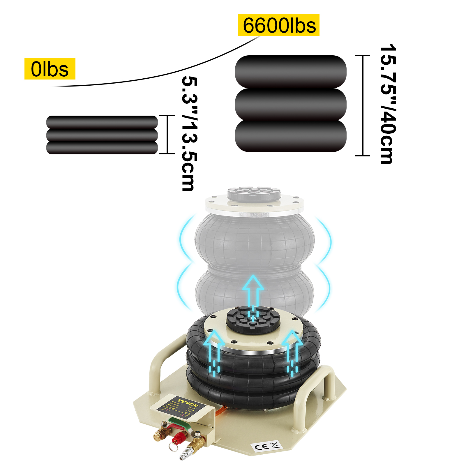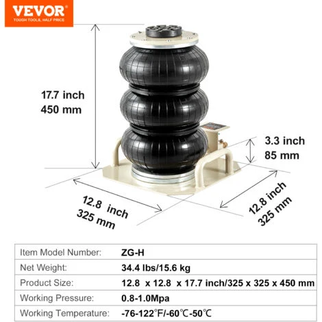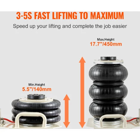 - Cric a Economie de Main deŒuvre : Capacite du cric pneumatique : 3 T. Hauteur minimale : 135 mm. Hauteur maximale : 400 mm. Il ne faut que 5 secondes pour le soulever. Temperature de travail : -60 a 50 ℃. Entree deair : G1/4. Notre cric a triple sac est le moyen le plus simple et le plus rapide de faire lever la voiture.