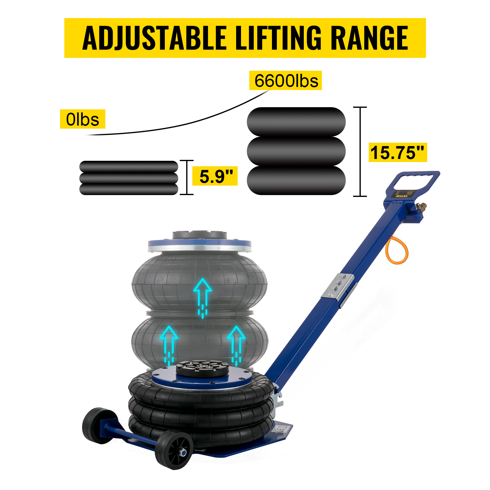 - Cric a Economie de Main deŒuvre : Capacite du cric pneumatique : 3 T. Hauteur minimale : 150 mm. Hauteur maximale : 400 mm. Il ne faut que 5 secondes pour le soulever. Temperature de travail : -60 ℃ ~ 50 ℃. Entree deair : G1/4 (6,35 mm). Notre cric a triple sac est le moyen le plus simple et le plus rapide de faire soulever la voiture.